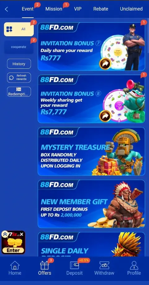 88FD Game is an online earning app like K666 where everything works within one clear system. It does not focus only on showing games; it offers a complete system where you can choose how you want to play and earn money. Whether you want to earn by playing or by inviting others, this app offers everything. Everything on this platform is properly organized, you can play games, get rewards in wallets and withdraw them to your local account. Moreover, the app is built with a secure system, so you can trust that your personal data will stay there. Besides this, the app offers customer support; if you find any issues with login or withdrawal, you can contact them.