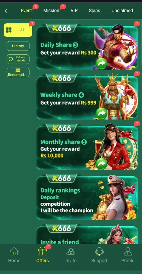 - First, log in to your K666 account using your mobile app or PC browser. The home screen shows all available games and current offers.
